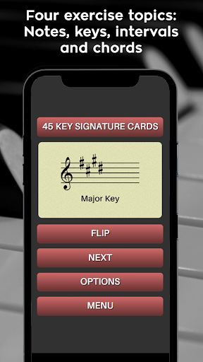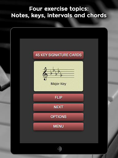 Customizable exercises - Control the level of difficulty with the options menu. A variety of settings allow you to set up the exercises the way you want. Great for musicians of all ability levels.
