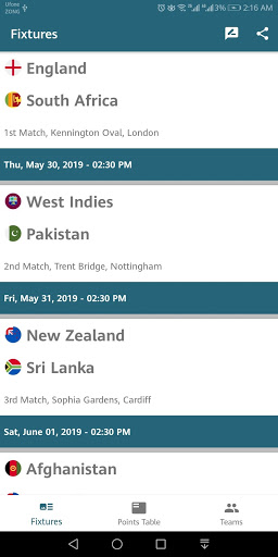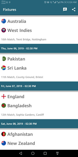 This app shows the schedule of Cricket World Cup 2019 with timing, date and location.
