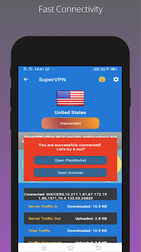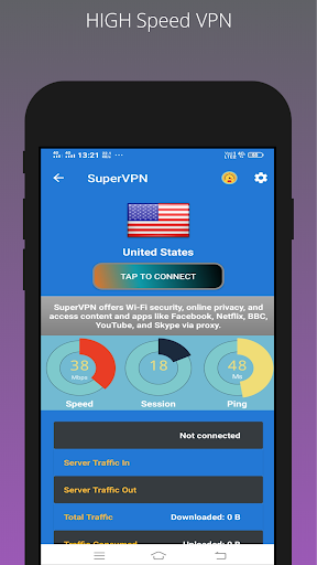SuperVPN is a lightning-fast app provide VPN proxy service. Not need any configuration, just simply click one button, you can access the Internet securely and anonymously.