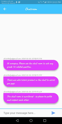 * The App offers a chatroom for Grade 12 learners to ask any school related questions and more. There are tutors and mentors who can answer the questions and also ther fellow students.