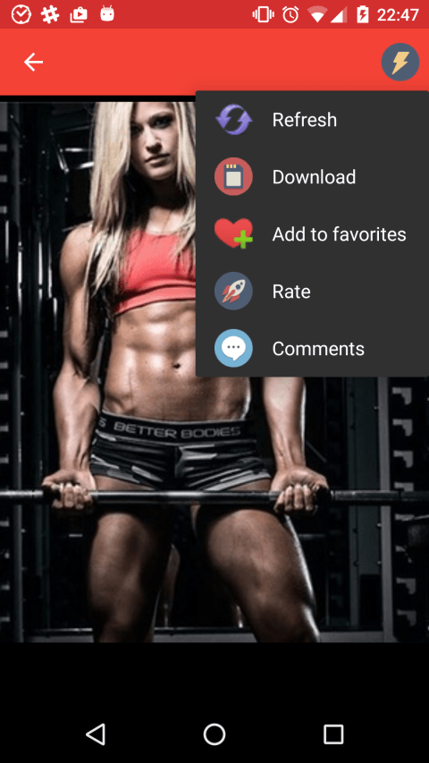 Hourly updated body builder girls gallery application Features: *updates each hour; *images can be downloaded to sdcard; *password protection; *favorite image lists; *image ratings;