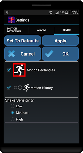 * TVMD displays motion icon in case amount of motion detected exceeds the threshold set by user. The app plays sound with the volume level proportional to the amount of motion detected.
