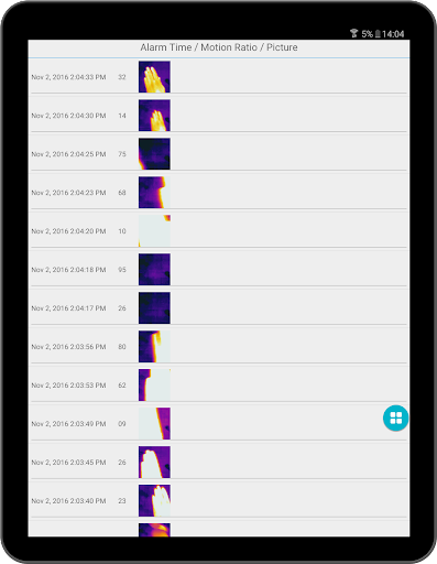 * The main problem with the motion detection applications is the shaking of the devices during the observation. Shaking devices yield false alarms. ThermoVisual Motion Detector application has specially designed algorithm to minimize this drawback. The app automatically stops motion detection in case of device vibration.