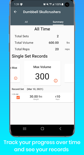 - View personal records and cumulative stats for exercises, including max weight and max volume