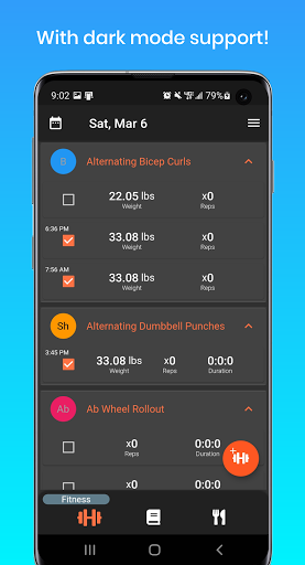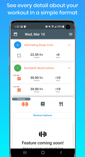 - View workout summaries and totals for each day using the draggable sheet on each page. Data includes total reps, total sets, and total volume