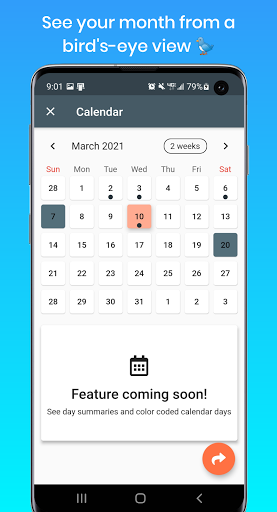 - View all workouts in a calendar view with weekly, two week, and monthly views