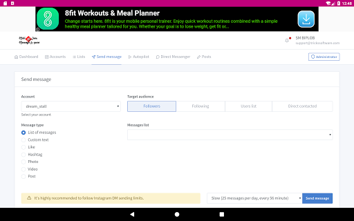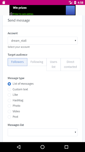5. "Send Message" Means "Instagram Messenger" Because it works like Facebook Messenger but for Instagram. So, we Call that section Instagram Messenger. Instagram Messenger area covers: * Message type *Target audience *Messages list *Send Message (Number of messages you wish to send per day automatically.)