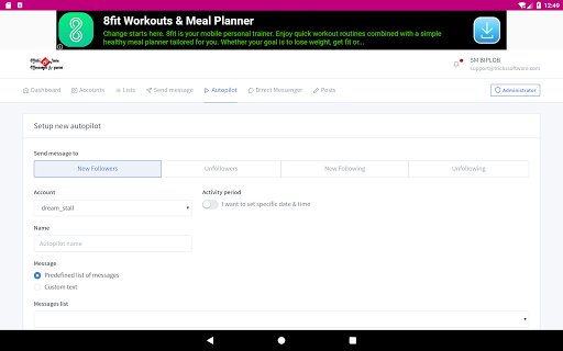 Send Message: This is the most useful section in the Instagram Messenger area of the app. because you will be able to scale your marketing plan. You will be able to scale the number of messages you wish to send per day. Such as 200 messages per day 7 minutes interval. or you can select 25 messages per day every 56 minutes interval. So, This is really awesome for the marketers, especially for eCommerce business owners. Next tab called Autopilot of Instagram Messenger. This is the automatic action handler of the messaging system in the Instagram Messenger.