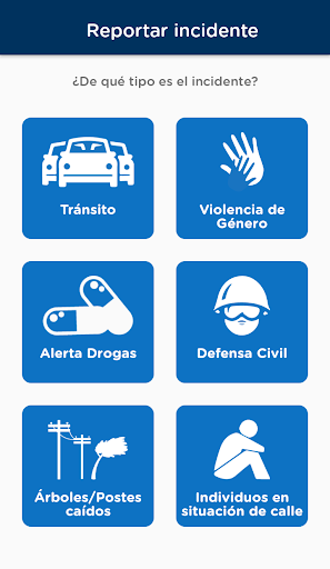 - Reportar un incidente de Tránsito, Violencia de Género, denuncia por venta de drogas, Defensa Civil, individuos en situación de calle y postes o árboles caídos en la vía pública.