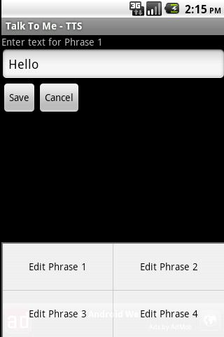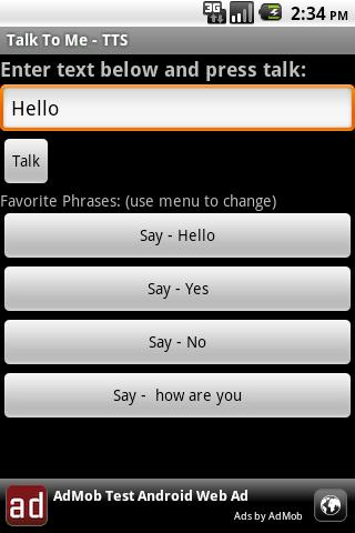 Make your phone talk to you. Type in words and push talk.Includes 4 phrases you can edit and save to quickly say your favorite phrases.Please email me with ANY issue or enhancement requests.