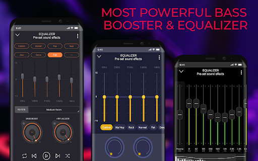 Boost your music experience with 10 amazing presets, 5 bands, bass booster, music virtualizer & 3D reverb effects adjustments and much more.Best Music player & Audio player with powerful equlizer, bass booster and sound changer.