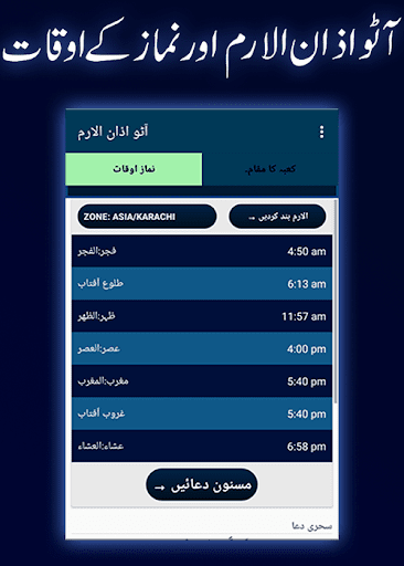 Muslim Apps 360 Presents Auto Azan Alarm Urdu Edition which gives you accurate prayer times & Notification before Sahri and Iftar in Urdu. The Prayer times algorithm supports a large Prayer calculation methods adopted by many Muslim countries. If you want you can change the prayer method manually in the Settings tab.