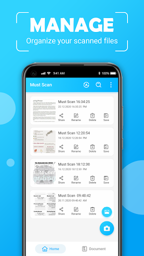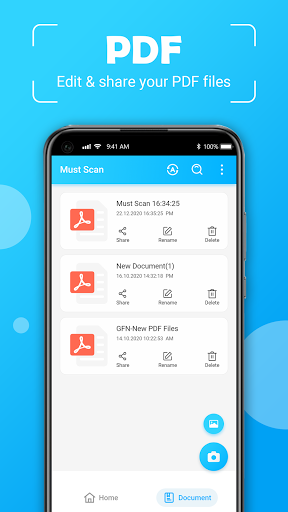 Open the camera, scan the paper documents, save them permanently, manage them easily, and export PDF to your colleagues.