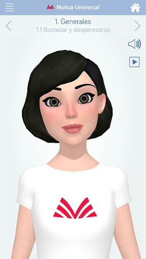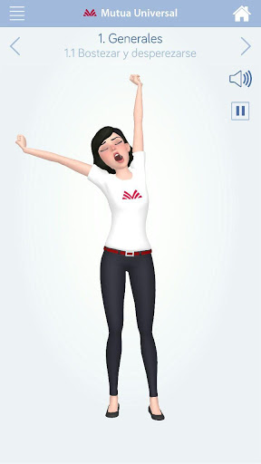 La App está protagonizada por un simpático personaje, Ana, que te guiará en cada ejercicio, explicándote la manera correcta de hacerlo y demostrándolo para que lo veas, y una vez los hayas aprendido, podrás hacerlos por tu cuenta, y consultarla cuando tengas dudas. También dispones de un menú de acceso desde el que puedes elegir un grupo de ejercicios o un ejercicio determinado:
