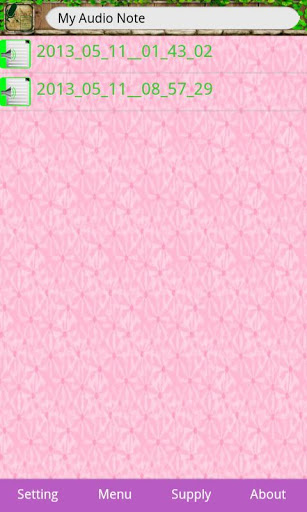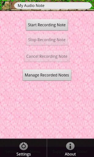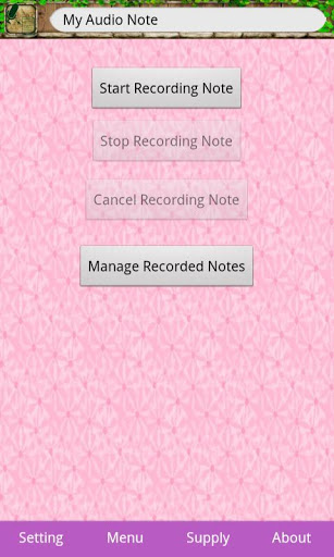 Are you still using the old note-taking method to write down your memo or schedule Are you following the new trend to take notes with your smart phones for convenience consideration?All above are out of date and inconvenient actually.You would better to use this app- My audio Note.With My Audio Note, you can:>> Record your audio sounds and then save them;>> Manage your recorded notes simply and conveniently.Operation steps:1.Click Start to make a record of your real-time words. The contents can be your daily memos, your recent schedules or plans. You just need to say them towards this app, then it will record these information for you in audio formats and help you remember your memos or plans;2.Click Stop to finish the recording;3.Click Cancel to cancel the recording;4.Click Manage to play and listen to your recording or manage them.Conclusion:For its convenience and simplicity, we believe this audio note app will replace most of the out-of-date note-taking apps one day.Now we offer it to you freely. Do not miss it.Thanks!#################################1.We hope you do not mind reading some notification ads or icon ads when you use this app.2.You can delay the screen turning off time to one minute. After that, you need to go to deactivate this app in device administrator if you want to uninstall this app.##################################Memo can refer to a brief note. The briefing note can serve include: conveying information; informing decisions, making a request, providing a response to a question, making a suggestion, presenting an informal report, proposing a solution to a problem, or documenting a reference for future use.So memo plays important role in our life and word for modern office workers.Here we refer to a memo in audio format in this app.