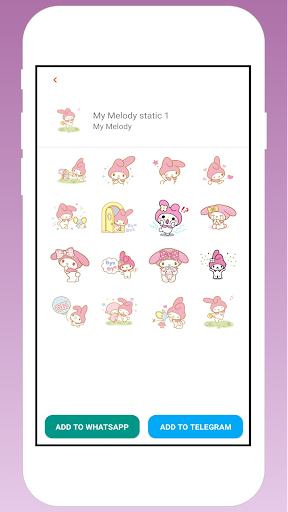 kawaii My Melody sanrio stickers are well collected and you can add them easily to WhatsApp & Telegram chats. The stickers are named in groups so that you can find and add stickers as you like.