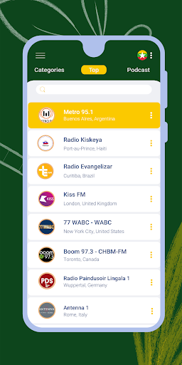 • ''World'' – listen to Android radio stations from all over the world.