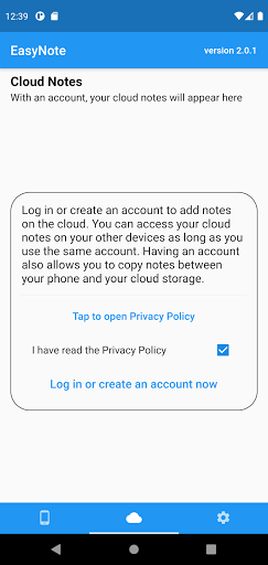 This is your plain old text keeping notes. You can either create and keep your notes on your phone or create an account to store them on the cloud. With this single account, you can access your notes from your other devices where EasyNote is installed. Account creation is free.
