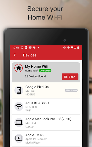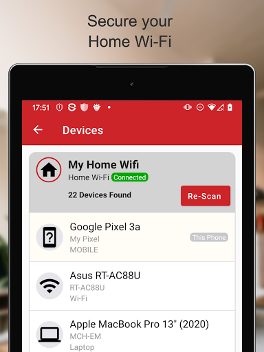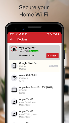 • Your home wifi network by scanning all your other connected devices (printer, speakers, TV, etc.) and identifying potential threats and vulnerabilities;