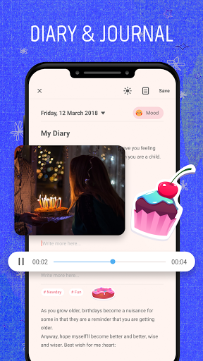 My diary is a free online diary with lock. You can use it to record daily journal, secret thoughts, journey, mood, and any private moments. It is a diary with picture, supports adding themes, stickers, mood, font, etc. to make your personal diary more vivid and safe.