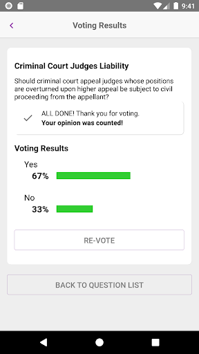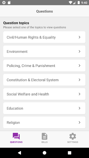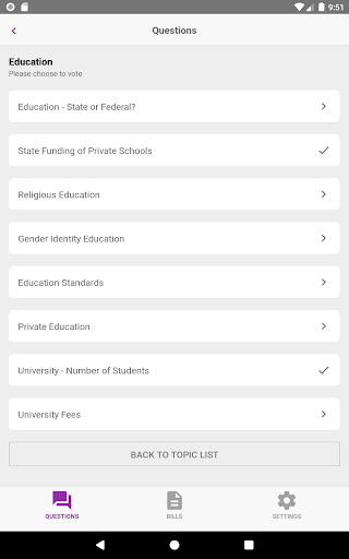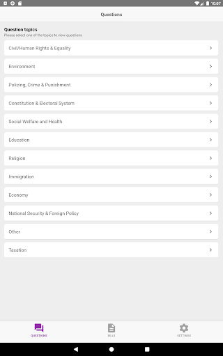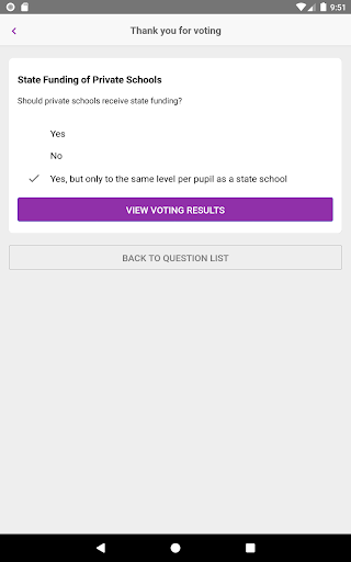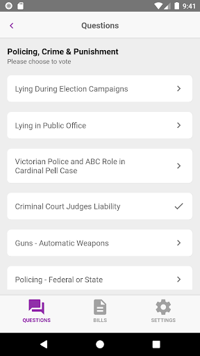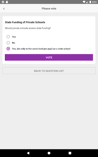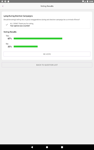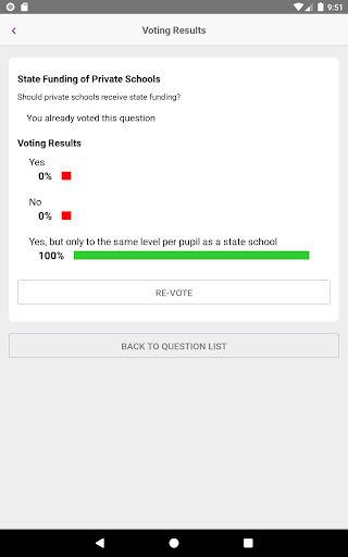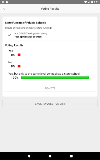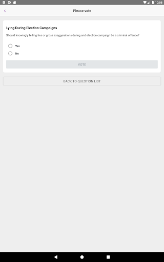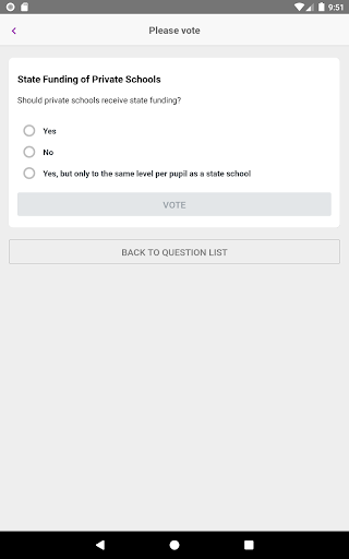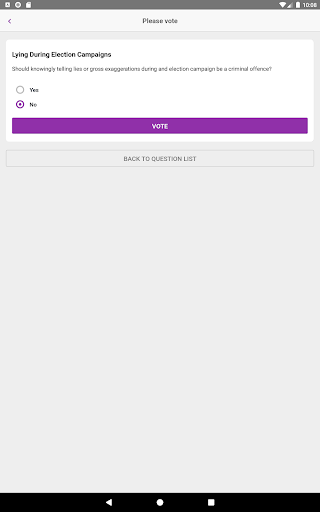 My Direct Democracy is a free and anonymous mobile only app, where users can vote for or against bills currently being considered by their political representatives and answer questions on the big issues facing our society. After voting, members can see how many other members agreed or disagreed with their position and My Direct Democracy will collate the results by political constituency to ensure our political representatives know what the people who vote for them expect of them.