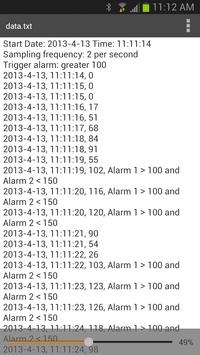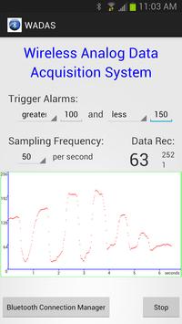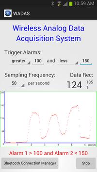 This app is part of a wireless analog data acquisition system. The main component of this system is an external hardware controller that interfaces with this app. Various analog sensors such as pressure sensor, distance sensor, light sensor, temperature sensor, and many others can be used. These sensors are connected to the controller. The analog data from these sensors are first digitized and then sent via Bluetooth to the mobile device. The data is plotted in real time on a graph and also saved to a file for future analysis. Two trigger alarms can be set. Various alarms connected to the output of the controller are activated when the data is within the alarm thresholds. For more information email to info@mygadgets2.com