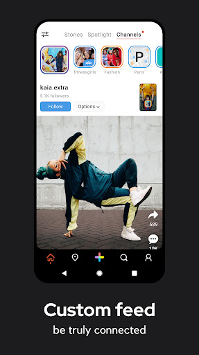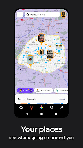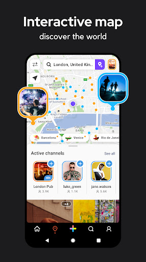 Start your social experience from anywhere in the world on our interactive map. Enjoy direct connections and smart navigation to swipe and scroll through channels with chronological feed.