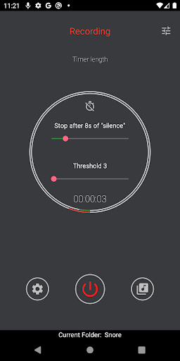 E.g, in a quiet place, for snore recording, the threshold = "4"~"8"/the silence=10s, for talking, the threshold ="2"~"5"/the silence = 4s . Those settings are for your reference, might need to be adjusted slightly.