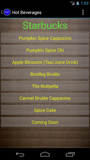 This App makes ordering your favorite Starbucks Drink fast and easy, Just select the beverage that you want, then show the local Barista your phone when the app says to "Show this Page to the Barista". These Drinks were mostly designed by actual Starbucks Employees. NOTE: This is just the lite version, which includes 4 Recipes from each category, except "Other".