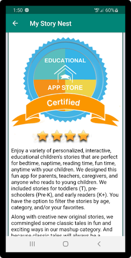 We are proud to announce My Story Nest is now certified and rated by Educational App Store. Our certificate is in the app and on our website.