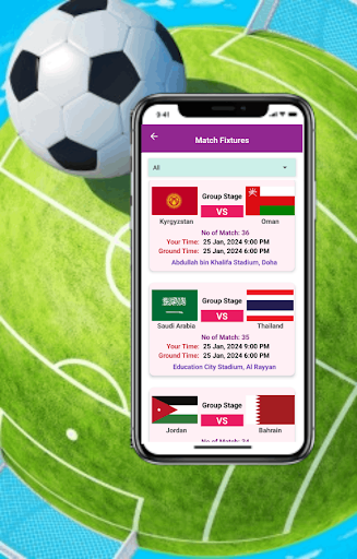 The app provides you with the ultimate source for AFC Asian Cup Football, 2023 football match schedule, groups, schedules, match result,