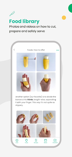 Foods: Detailed food library with photos, videos, and instructions on how to cut and offer finger foods or how to offer them using responsive spoon-feeding