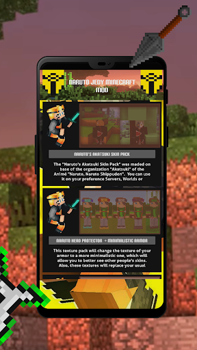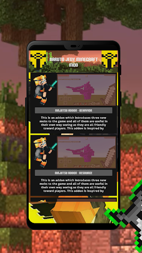 With Naruto Jedy Addons for MCPE you can run like naruto, spawn kyubii kurama and this addons naruto mods for minecraft pe you can use jinchuuriki ninjutsu such as byakugan, sharingan, mangekyo and susanoos. In addition to ninja mod, here we also provide parkour maps or konoha maps mod mcpe. You can play this mods pack single player or with your friends in roleplay mode, because with Naruto skins for your mcpe you can choose the custom naruto skin you want. This skins of ninja only has several versions of naruto skins for minecraft pe.