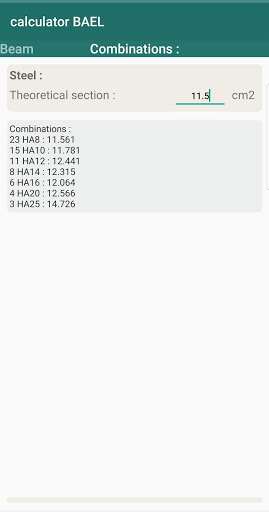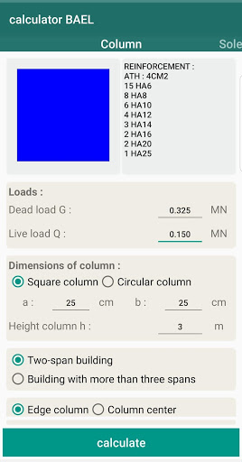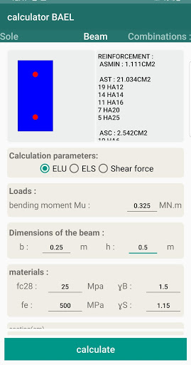 This application will allow you to design reinforced concrete elements according to the BAEL regulation (column, soles, beams) and also to propose you steel combinations for the reinforcement of the elements.
