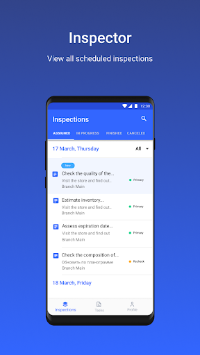 1. Inspections are created and configured in the Web version for administrator. Assignments are given out for specific date, time, inspector, and branch. You can set up checklists in the system, put complex logic into them and customize them for different types of objects.