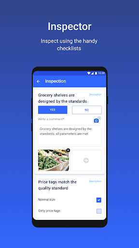 3. Using the mobile application, the inspector enters data about the inspected object (goods, services, processes) using a checklist. The checklist consists of closed (single choice or multiple choice) and open questions. Users can add photos to some answers.