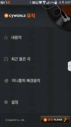 CyBGM Service changed from CyBGM to Cyworld Music. Users can listen to my BGM in cyworld mini homepage through the phone anytime and anywhere, and hear once I buy music in a music shop. Copyright ⓒ Cyworld . All rights reserved.