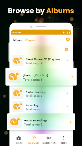 Music Player – Audio Player app is designed with a good user interface and it helps the user to easily listen to all types of music in one app. Users can easily play and pause the song in this app and click on the next button to listen to the next song. You can also delete songs directly from this app without going to my files app. You can also create a new album and browse songs by album. Mp3 player scans all music files automatically and adds them to your audio player app. Listen to songs every day and enjoy. Mp3 player - Supports all popular audio formats.