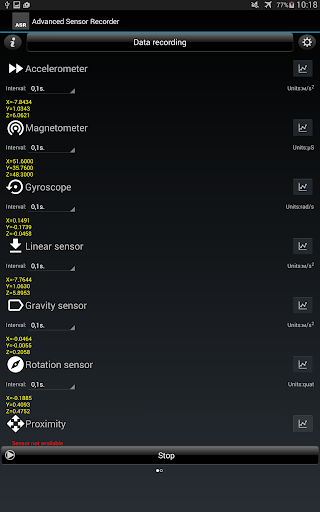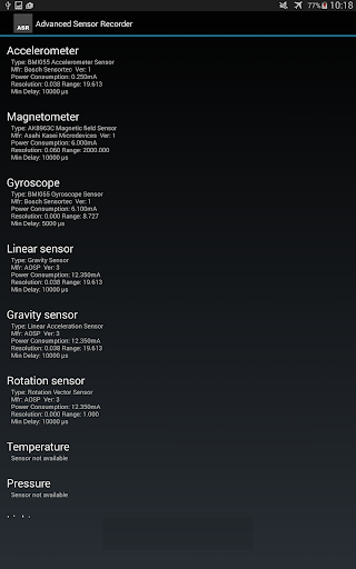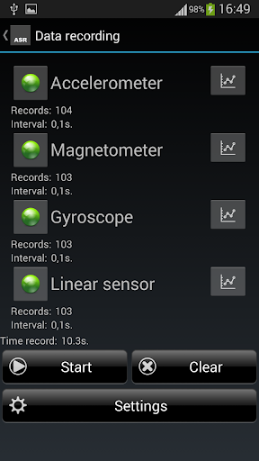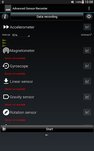 Advanced Sensor Recorder (ASR) shows the available sensors of your smartphone or tablet, plot graphics and allows to record sensor data for future use. Using of Google Maps API allows to show your GPS data on the map (it depends on version of OpenGL ES of your device).