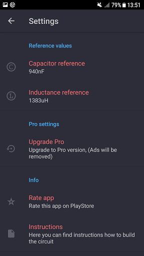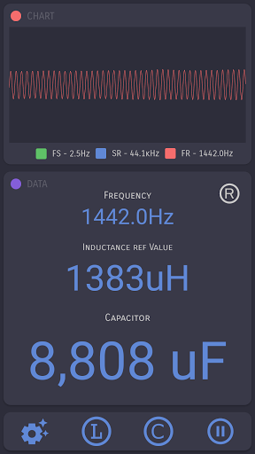 Use this app is easy, you just need build a small circuit (easy to build) and connect to the circuit capacitor or inductance you need measure, put your smartphone near from this LC meter circuit choose what you want measure, inductance or capacitor and press play button in the app. The app will detect sound frequency from buzzer and will show value.