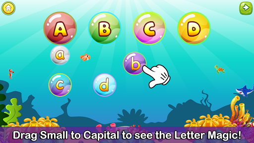 It's a fun aquarium game! Children can take baby animals to their mothers to match Small letters with Capital letters and also match the small letter bubbles with capital letter bubbles.