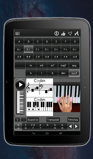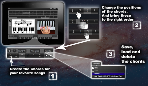 - see the chords as music notes on vitual sheet music, as marked keys on a piano keyboard and as photos with finger positions.