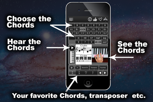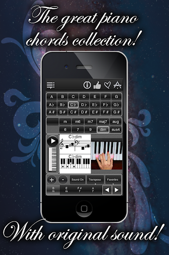 This app can show you over 120 chords that you can play on piano, electronic keyboard/synthesizer, organ, grand piano or baby grand piano. These are all the chords you'll need to play all your favorite songs!