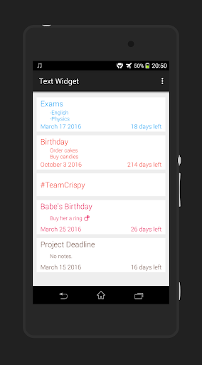 With Text Widget, you can create simple texts, notes with different settings for each widget & with Day Counter you can count the days from/until your special day. Text widget and Day Counter Widget is really helpful when you're trying to remember something, you can just place a sticky note on your home screen or if you want to count the days left for your anniversary, you can just place a D-day Counter on your home screen and add some notes to it, for example buy your wife a ring on her birthday.