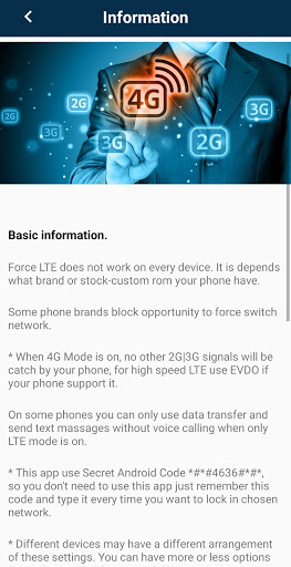 Force LTE Only - 4G LTE Mode app helps you to find and search for 4G LTE signal. Once you locked to 4G Mode, no other 2g/3g signals won't be catch by your phone so your device will always be in 4G Network.