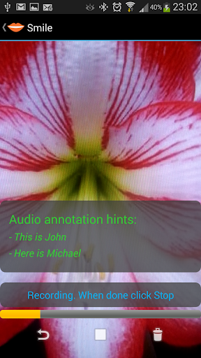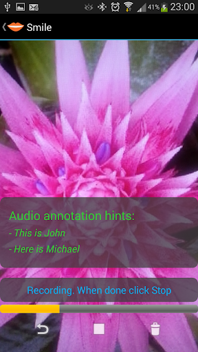Immediate Voice Annotation: can be performed following the taking of a picture by the means of a brief voice recording. Smile uses automatic speech recognition to extract text from speech, and store the voice, together with the text, as metadata inside the picture file.