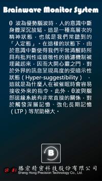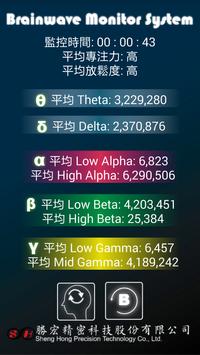Brainwave Monitor System透過您的大腦狀況即時將腦波數據於折線圖顯現出來,即時監看的腦波數據包含:專注力、放鬆值、Theta、Delta、High Alpha、Low Alpha、High Beta、Low Beta、High Gamma和Low Gamma。只要使用勝宏精密有限公司所提供之mindwave MOBILE腦波儀透過藍牙連接至智慧型手機即可。