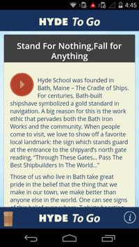 kids develop the character and leadership they need to fulfill their unique potential. Whether you hope to strengthen character within yourself or in someone else, the Hyde To Go App offers short inspirational lessons to help people do just that. These lessons are offered as brief, helpful steps in the long journey of personal, family, or community development. Each lesson offers a reading that can be accessed either visually or audibly and is followed by a few questions to consider. The lessons are organized according to six categories: