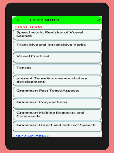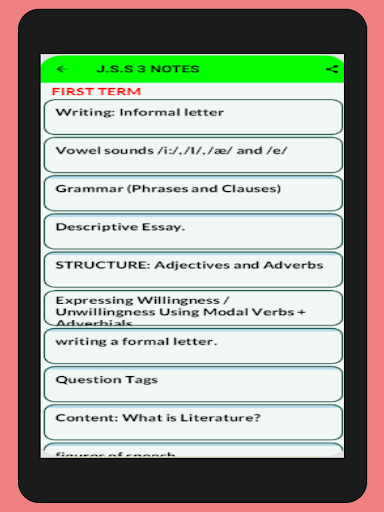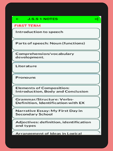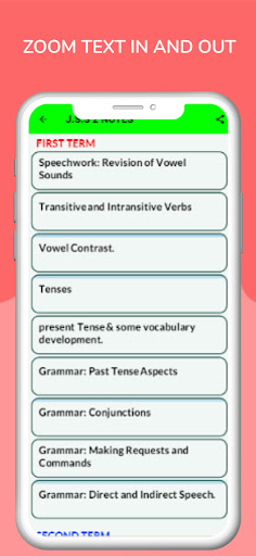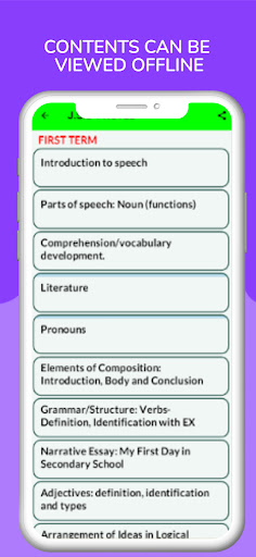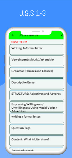 The app provides you with everything you need to learn and understand any topic in English Language Notes. All topics ranging from first term to third Term J.H.S./ JSS 1-3