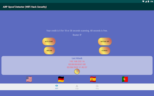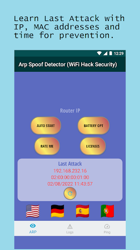 The languages English, German, Spanish, and Portuguese are all supported by ARP Spoof Detector.